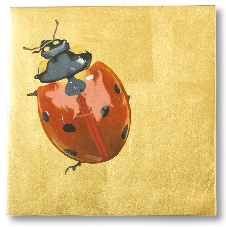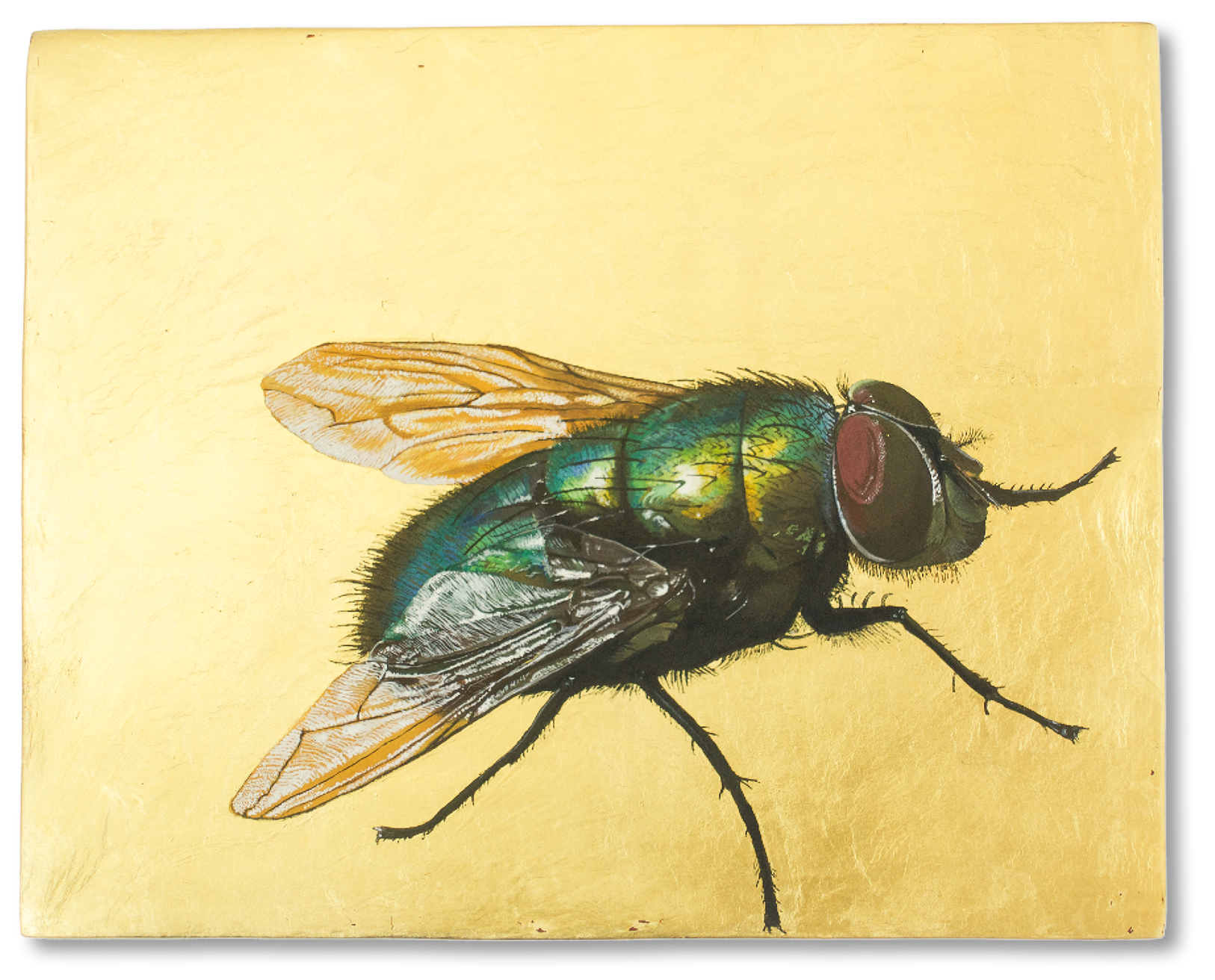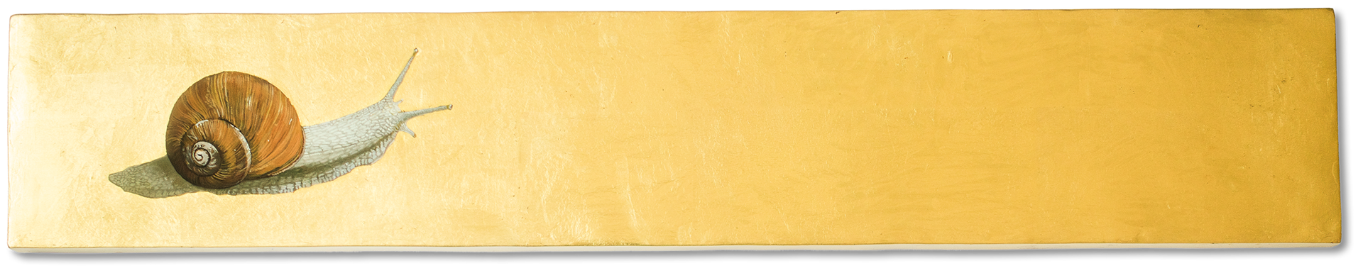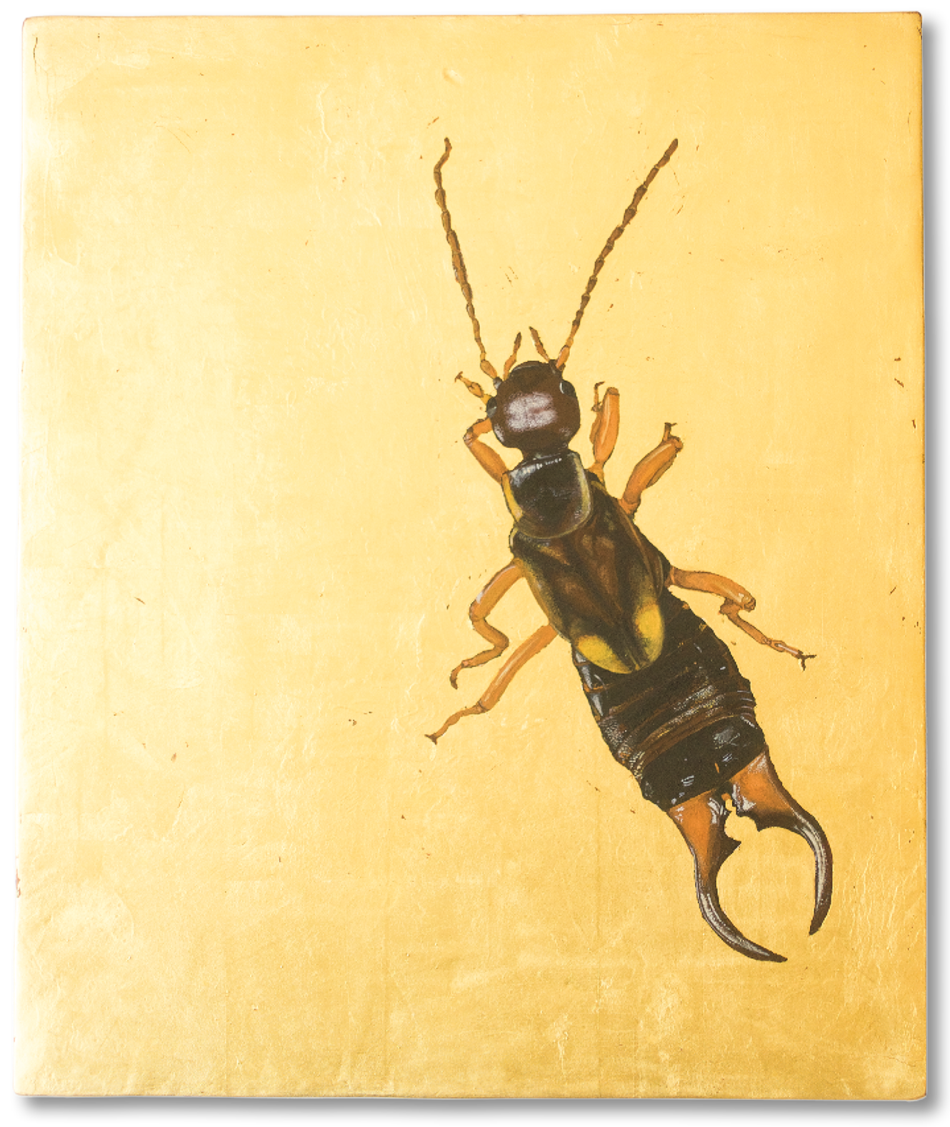 Und was, wenn auch solche Tiere in den Ikonenstand erhoben werden, die gemeinhin nicht gerade als niedlich oder ansehnlich gelten? Die winzig, kaum beachtet oder sogar verachtet sind? Ein Ohrenkneifer, eine Ratte, Schnecken mit und ohne Haus… Im Licht des Ikonengolds und auf ein Vielfaches ihrer tatsächlichen Größe gebracht, entfalten auch sie ihren Reiz. In den Ikonen erfahren die wenig beliebten Kreaturen so etwas wie ihre ästhetische Rehabilitation. Eine Schönheit auf den zweiten Blick, die entdeckt werden will. -Diese Bilder sind es auch, die die ironische Brechung auf die Spitze treiben. Wird hier die Kellerassel auf eine Stufe gestellt mit der Heiligen Jungfrau? Das ist doch fast schon Blasphemie. Oder etwa das genaue Gegenteil?