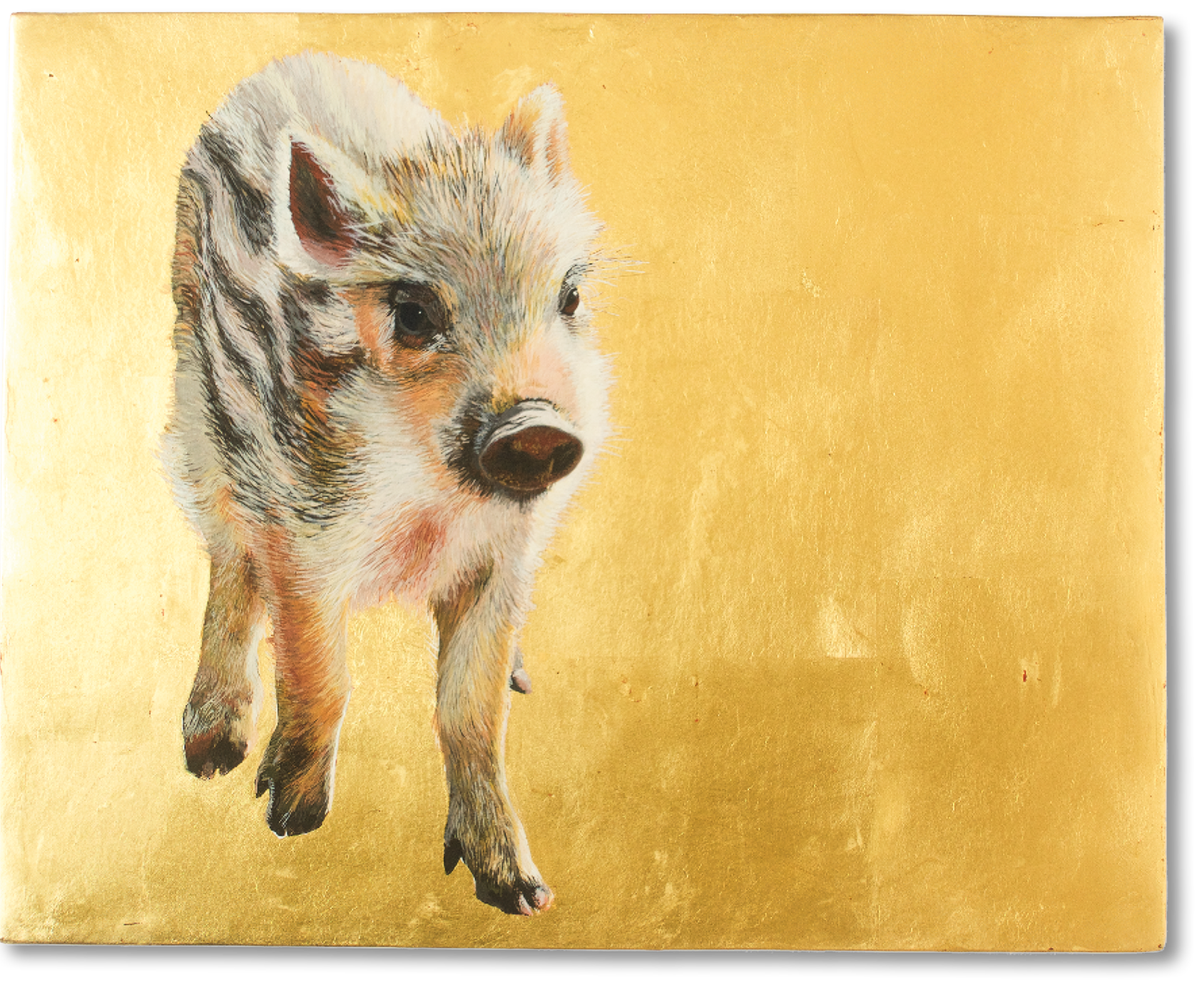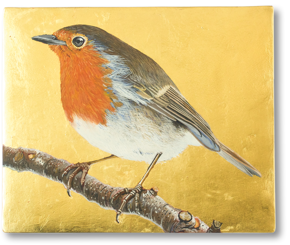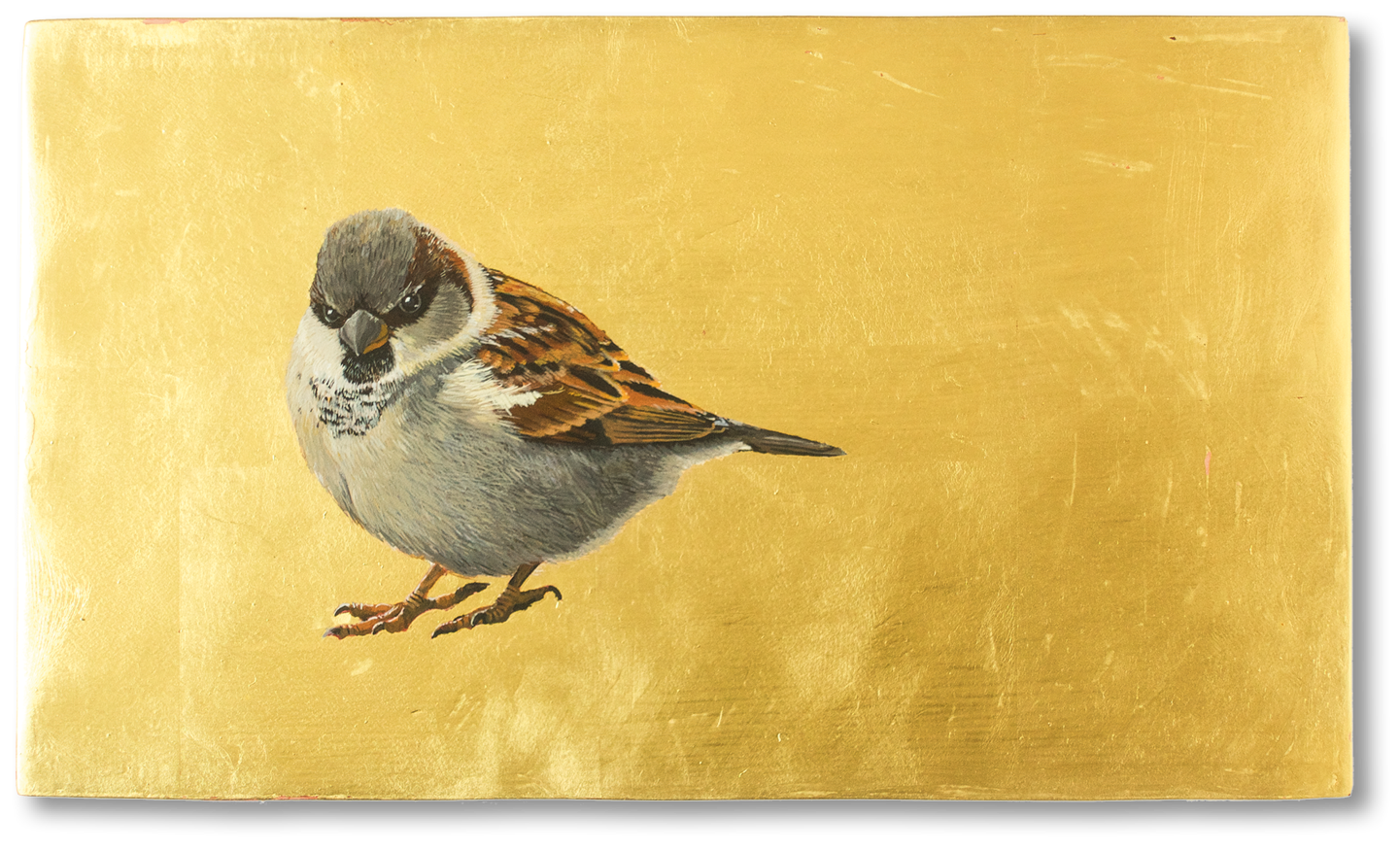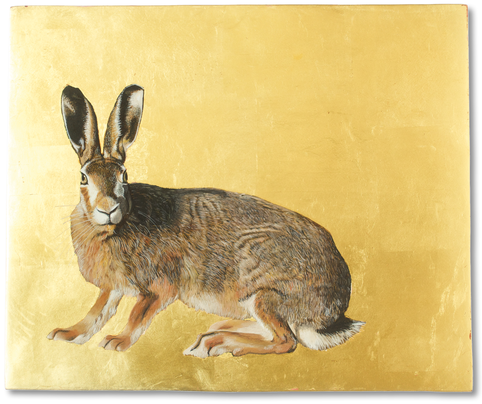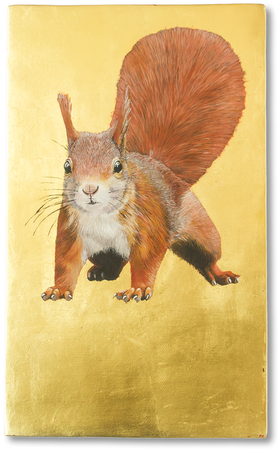 Was aber, wenn eine Ikone nicht Petrus, Johannes den Täufer oder die Madonna abbildet, sondern einen Igel, ein Eichhörnchen oder eine Blaumeise? Nach dem Gesetz der Ikone wird dann das gezeigte Geschöpf zum Gegenstand der Verehrung. Und wirklich: Wer der filigranen Feinheit von Stacheln, -- Haar- oder Federkleid nachspürt, wie sie sich gegen das flächige Gold stemmt, verspürt unweigerlich Ehrfurcht für das Original, die Schöpfung. Gleichzeitig schwingt beim Betrachten immer ein ironischer Unterton mit. Im Ernst? Ein Feldhase als Anbetungsobjekt?